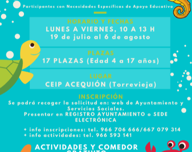 El concejal de Bienestar Social, Tomás Ballester, informa que se ha abierto el plazo de presentación de solicitudes para la Escuela de Verano “Caballito de Mar” para participantes con necesidades específicas de apoyo educativo. El número de plazas son 17 para las edades comprendidas entre los 4 y los 17 años, y se desarrollará en el CEIP Acequión (Torrevieja). La Escuela comenzará el 19 de julio hasta el 6 de agosto, con horario de 10:00 a 13:00 horas (sin comedor) y de 11:00 a 14:00 horas (con comedor).