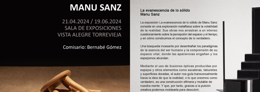 En palabras del comisario: “La evanescencia de lo sólido de Manu Sanz consiste en una exploración metafísica sobre la volatilidad de la realidad. Sus obras nos arrastran a un intenso cuestionamiento sobre la percepción del espacio y el tiempo, y en cómo construimos el concepto de lo verdadero. Una búsqueda incesante por desentrañar los paradigmas de la esencia del ser humano y la comprensión de su espacio vital; donde las apariencias engañan y los espejismos abundan.