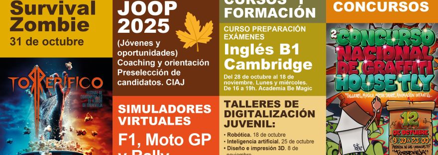 El edil ha informado que hay tres importantes actividades con motivo de Halloween: Un viaje a Port Aventura el fin de semana del 26 y 27 de octubre, el festival de cortos “Torrerífico”, organizado en colaboración con la Asociación Juvenil la Comarca y la sede de la UA en Torrevieja, también el sábado 26 de octubre y, como colofón, un Survival Zombie por las calles de la ciudad la misma noche de Halloween, el jueves 31 de octubre.