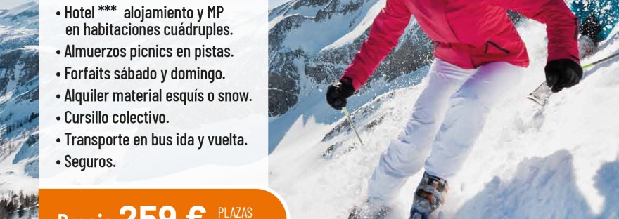 El viaje, dirigido a jóvenes de 16 a 35 años, incluye transporte en bus desde Torrevieja, alojamiento en habitaciones cuádruples en Hotel Reino Nevado*** en Pradollano (Granada), junto a la estación de esquí de Sierra Nevada, en régimen de Media Pensión, dos días de forfait, picnics en pistas, alquiler de material, cursillo colectivo y seguros, todo ello por un precio único de 259 €.