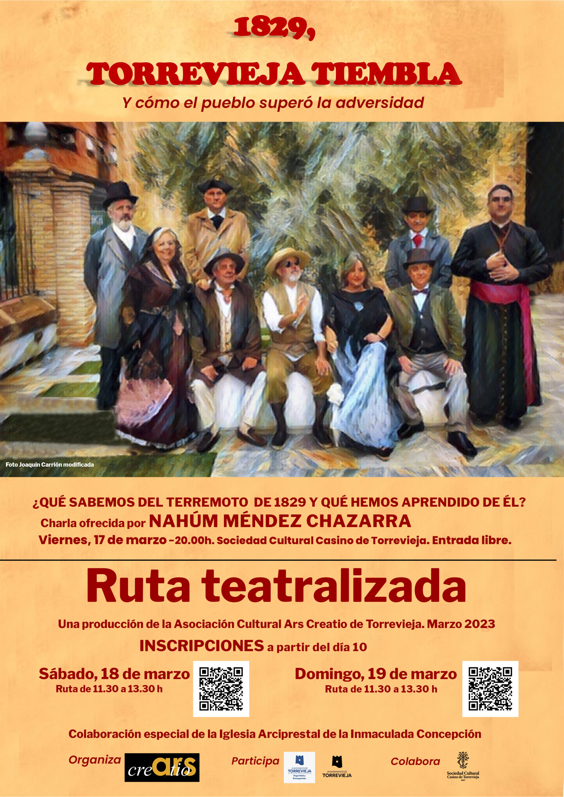 La Asociación Cultural Ars Creatio, con la colaboración de la Concejalía de Seguridad y Emergencias del Ayuntamiento de Torrevieja, presenta una nueva edición de las jornadas dedicadas al terremoto acaecido el 21 de marzo de 1829, con las que se pretende acercar al público una parte de la historia de la villa, en torno a la primera mitad del siglo XIX, y lo relacionado con el seísmo, que también afectó al resto de municipios de la Vega baja, y del que se repuso la población torrevejense con enorme sacrificio.