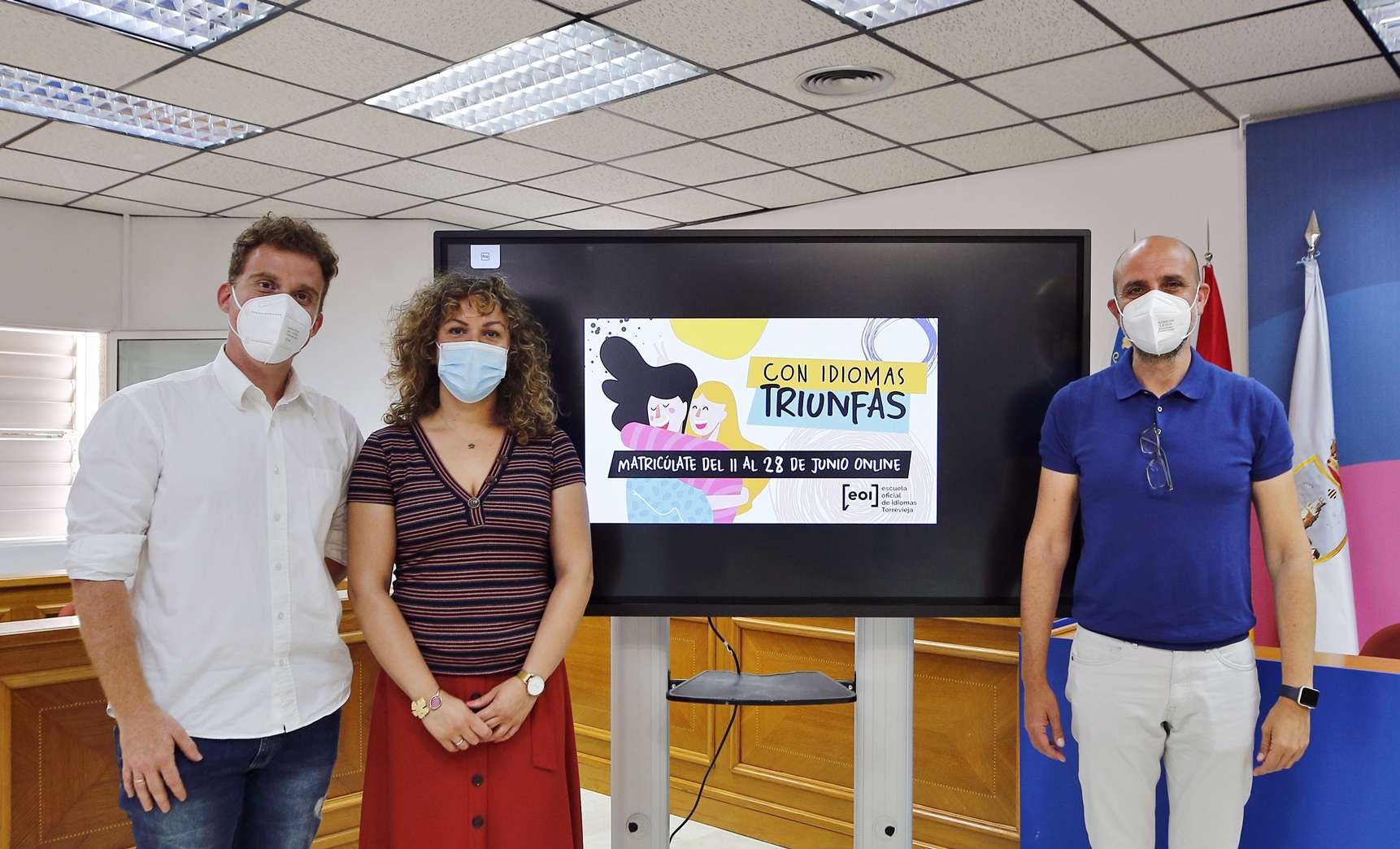 El concejal de Educación del Ayuntamiento de Torrevieja, Ricardo Recuero, acompañado del director de la Escuela Oficial de Idiomas de Torrevieja, Juan Manuel Margalef, y la jefa de estudios del centro, Adriana Valero, han informado del plazo de matriculación para el curso lectivo 2021/2022, que volverá a ser de forma presencial, del 11 de junio al 28 de junio. Los niveles de los 6 idiomas que oferta la EOI parten desde el nivel más básico (A2), hasta el nivel experto o nativo (C2).