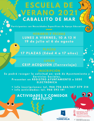 El concejal de Bienestar Social, Tomás Ballester, informa que se ha abierto el plazo de presentación de solicitudes para la Escuela de Verano “Caballito de Mar” para participantes con necesidades específicas de apoyo educativo. El número de plazas son 17 para las edades comprendidas entre los 4 y los 17 años, y se desarrollará en el CEIP Acequión (Torrevieja). La Escuela comenzará el 19 de julio hasta el 6 de agosto, con horario de 10:00 a 13:00 horas (sin comedor) y de 11:00 a 14:00 horas (con comedor).