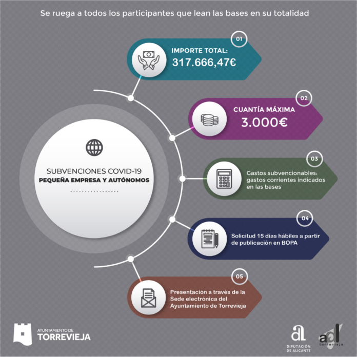 En el día de hoy se ha abierto el plazo de solicitud de subvenciones para autónomos y pequeñas empresas que ejercen su actividad en la ciudad de Torrevieja, grupos que están siendo de los más castigados por las medidas adoptadas para la lucha contra la pandemia. Con esta subvención, el Ayuntamiento pretende atenuar el impacto económico del COVID-19 impulsando la actividad económica en el término municipal, contribuyendo a facilitarles el cumplimiento de sus obligaciones y mantenimiento de la actividad empresarial y el empleo.