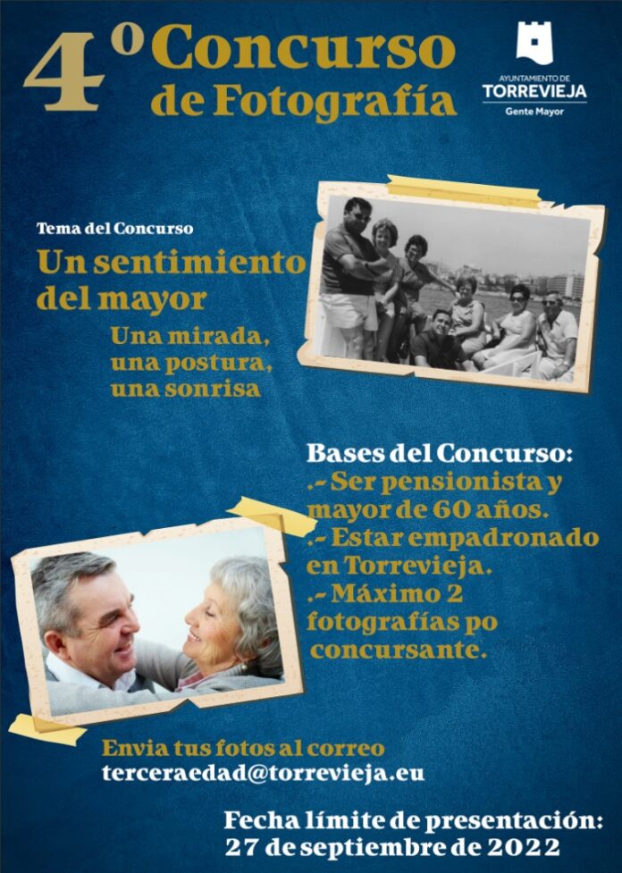 La concejal de Gente Mayor del Ayuntamiento de Torrevieja, Inmaculada Montesinos, informa que ya se ha abierto el plazo para participar en el 4º Concurso de Fotografía Homenaje al Mayor. El tema del concurso en esta edición es “Un sentimiento del mayor. Una mirada, una postura, una sonrisa”.