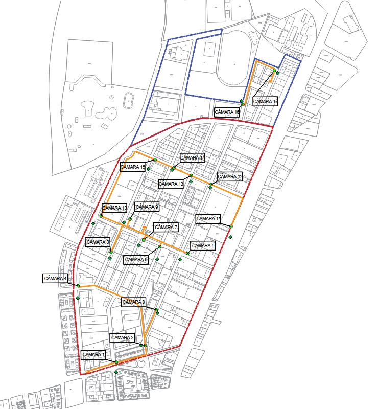 En todo el Parque Empresarial se plantea la instalación de 17 cámaras de videovigilancia en postes para colocar el soporte que permitirá la instalación de la cámara. Junto con ellos, se conectará a la red general de baja tensión, mediante la excavación de una zanja. Se trata de una instalación para gestión de señales de video a través de circuito cerrado de TV, así como los elementos de integración de comunicaciones, adaptados a nuevo sistema de gestión de video centralizado en la Policía Local. Será necesario un grabador en red para 17 cámaras IP de resolución hasta 12MP, con Tecnología Deep in Mind. Análisis de vídeo sobre 8 canales, con detección inteligente de personas. La comunicación entre la comisaría de policía y las cámaras, se realizará mediante un sistema de ondas de radio con una unidad base en la comisaría, y unidades suscriptoras en las cámaras IP.