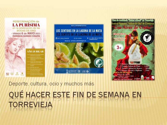 18:30 h.: Presentación candidatura elecciones 28 M. Pablo Samper. Salones Hotel Fontana19:00 h.: Festival de Flamenco «Salinas de Oro» de Torrevieja«Con aires de copla”.Gran Final. Casa de Andalucía «Rafael Alberti». Teatro Municipal de Torrevieja. 3 € . www.culturatorreveja.es – Taquilla