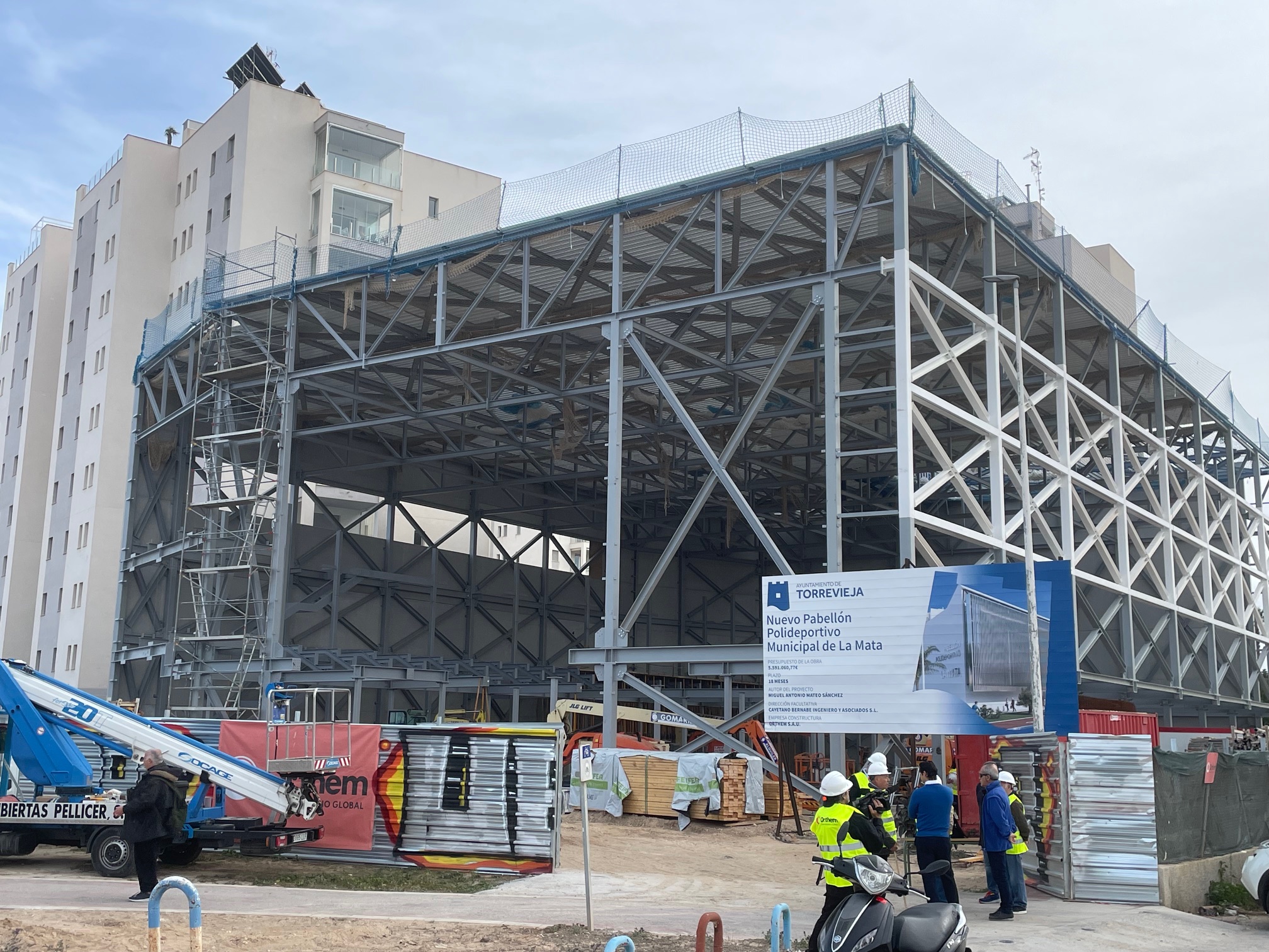 En la mañana de hoy, el alcalde de Torrevieja, Eduardo Dolón, acompañado por  la concejal de Deportes, Diana Box, el director de obra de ORTHEM, Ramón Guijalba, y vecinos de la zona, han visitado las obras del pabellón polideportivo municipal de La Mata, ubicado entre las calles Delfín, Francia y Avenida de los Daneses.