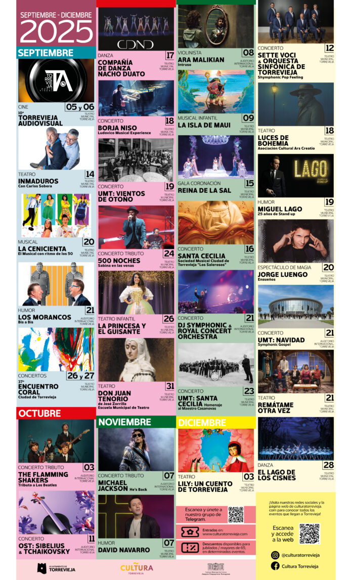 Grandes puestas en escena como “Estado de Alarma” con Lara Dibildos, “Inmaduros” con Carlos Sobera, “Remátame Otra Vez” con Belinda Washington, “Intruso” de Ara Malikian y “El Lago de Los Cisnes”; junto a los shows de humor de Miguel Lago, David Navarro, Juan Amodeo y también de Los Morancos; la magia de Jorge Luengo, el concierto con DJ de la Royal Concert Orchestra, los tributos a Sabina, a Michael Jackson, a Vaiana y a The Beatles; y una variedad de espectáculos con talento local, conforman el programa de la temporada septiembre-diciembre 2025 de Cultura Torrevieja