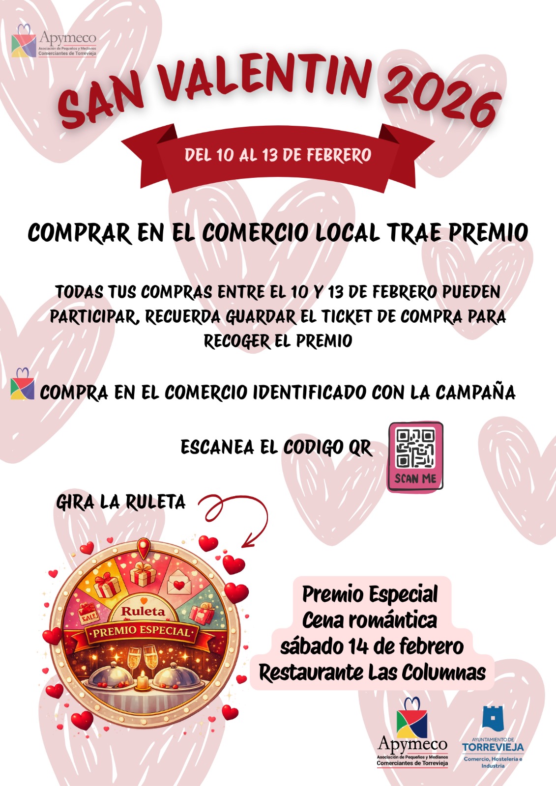 La Asociación de Pequeños y Medianos Comerciantes de Torrevieja (APYMECO) ha puesto en marcha su Campaña de San Valentín 2026, una iniciativa destinada a fomentar el consumo en el comercio local y premiar la fidelidad de los clientes que eligen comprar cerca.