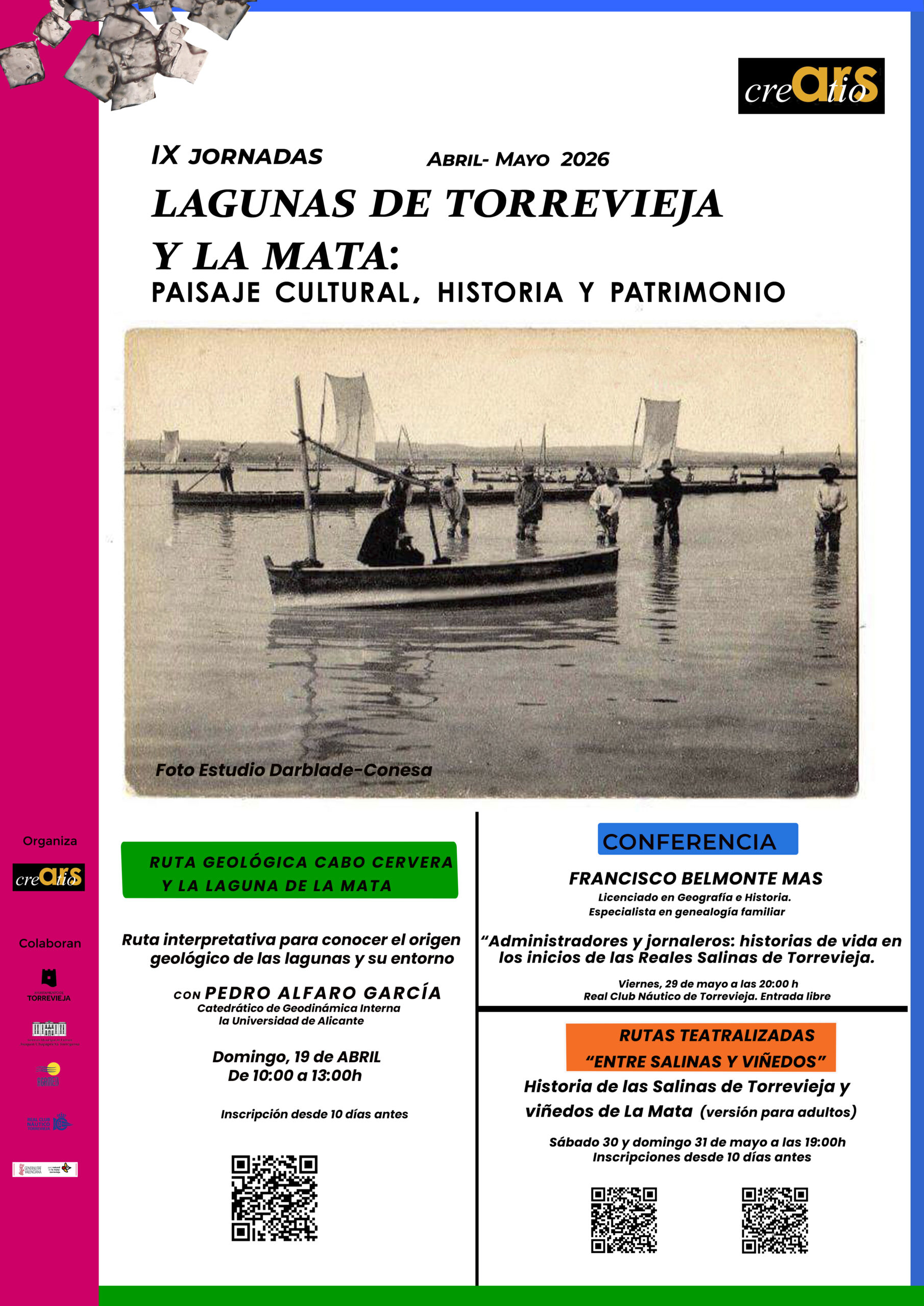 Asimismo, el viernes 29 de mayo tendrá lugar la conferencia del especialista en genealogía Francisco Belmonte Mas, bajo el título “Administradores y jornaleros: historias de vida en los inicios de las Reales Salinas de Torrevieja”, en el Real Club Náutico de Torrevieja, con entrada libre hasta completar aforo.
