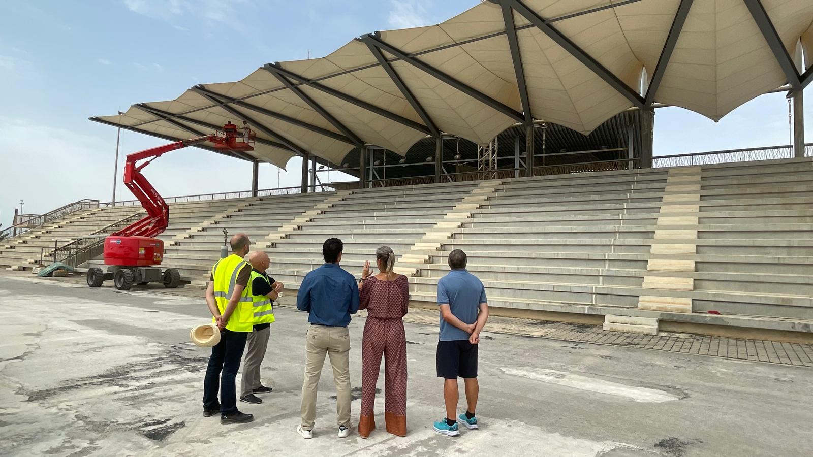 Asimismo, los asientos de plástico de las gradas presentan un desgaste por el uso y la exposición a las inclemencias atmosféricas, por lo que deben ser sustituidos. Se retirarán para su reciclaje y se instalarán nuevos asientos de plástico monobloque. La pérgola existente en la zona de gradas se está repintando y se lleva a cabo la renovación de la protección de madera de su estructura portante.