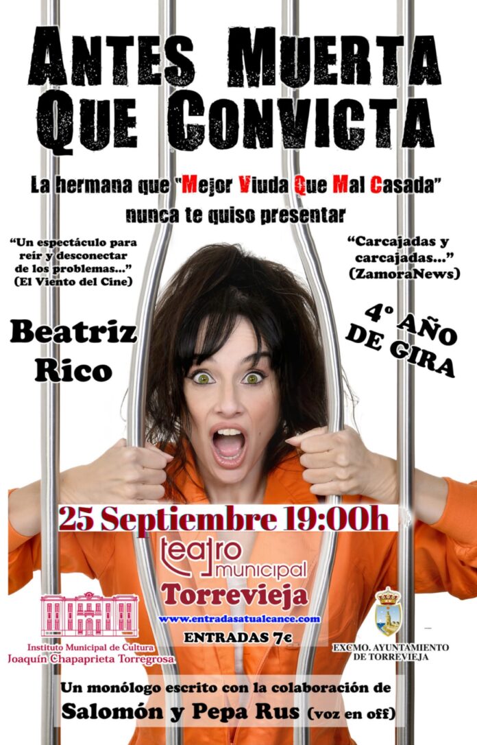 Tras el éxito de su anterior proyecto, Mejor Viuda que Mal Casada, Beatriz Rico regresa a Torrevieja con Antes Muerta que Convicta (https://www.antesmuertaqueconvicta.com/), un espectáculo de comedia donde las risas y la diversión están aseguradas.