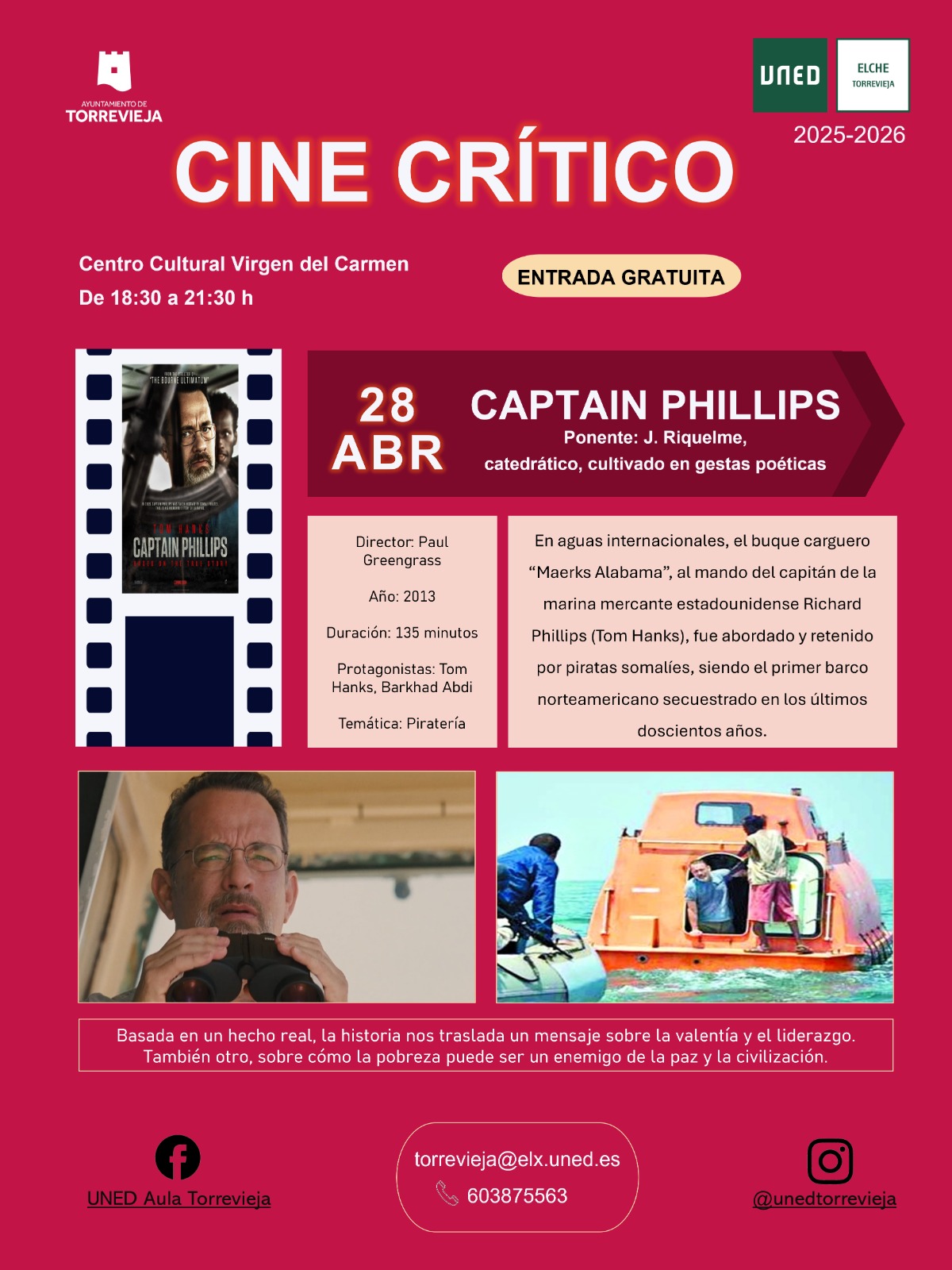 El ciclo Cine Crítico organizado por el Aula UNED de Torrevieja continúa su programación con la proyección de Captain Phillips, una de las películas más impactantes del cine reciente basada en hechos reales.