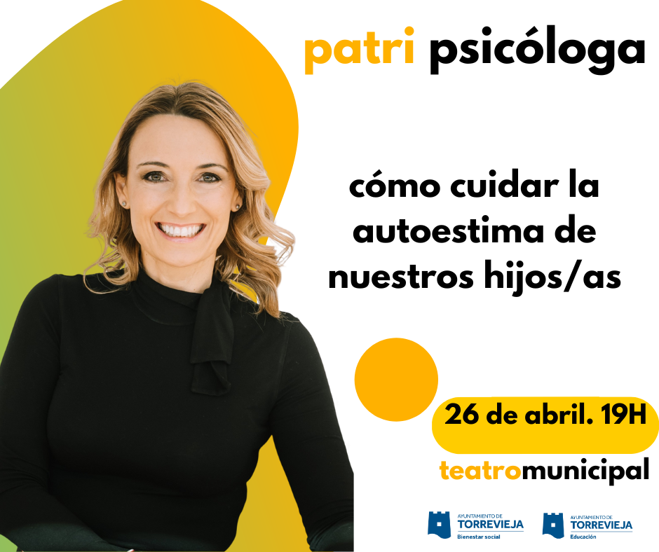Patri Psicóloga realizará una Charla titulada “Cómo cuidar la autoestima de nuestros hijos e hijas”, en el Teatro Municipal de Torrevieja, a las 19:00 horas. Las entradas para esta charla se agotaron hace semanas.