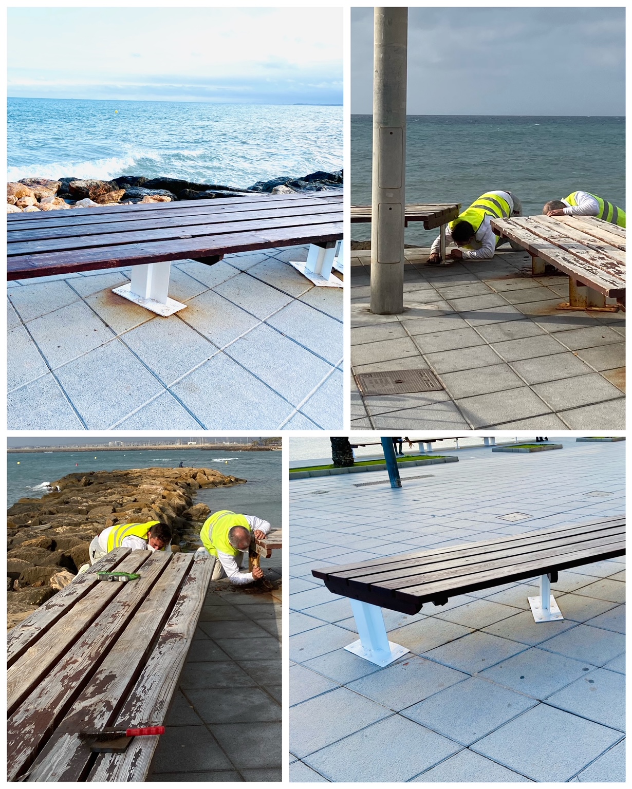 Los trabajos están consistiendo principalmente en el lijado y posterior pintado con una primera capa de pintura epoxi y una segunda capa de pintura de poliuretano en las bases metálicas. Lijado y posterior pintado en dos capas con pintura para protección de la madera en los asientos y respaldos de madera. Asimismo, también están incluidas pequeñas reparaciones de las bases metálicas o maderas en mal estado.