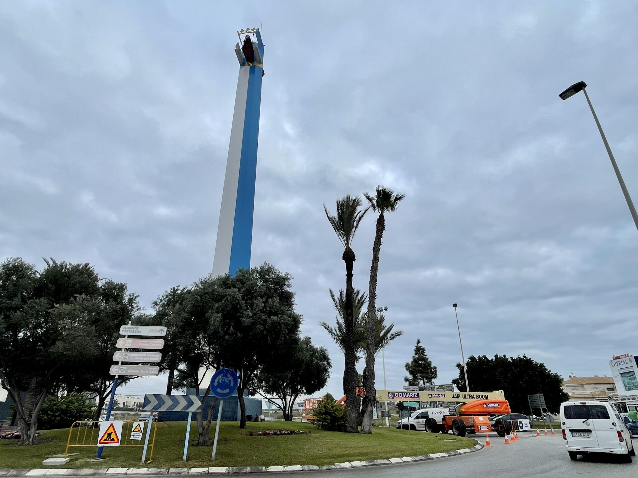 La concejal de Cuidado y potenciación de la imagen urbana, Carmen Gómez Candel, informa que continúan los trabajos de restauración y pintado del hito ubicado en una de las rotondas de la Avenida de las Cortes Valencianas (denominado popularmente “el pirulí”) y de la pérgola de la plaza de Encarnación Puchol de La Mata, que desde hace nueve años no habían tenido ningún tipo de actuación.