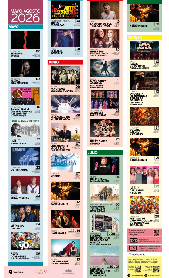 La programación cultural de Torrevieja se refuerza este verano con una ambiciosa propuesta que supera los 90 espectáculos entre los meses de mayo y agosto de 2026. La iniciativa, impulsada por Cultura Torrevieja, incluirá conciertos, teatro, comedia, magia, zarzuela y grandes producciones escénicas.