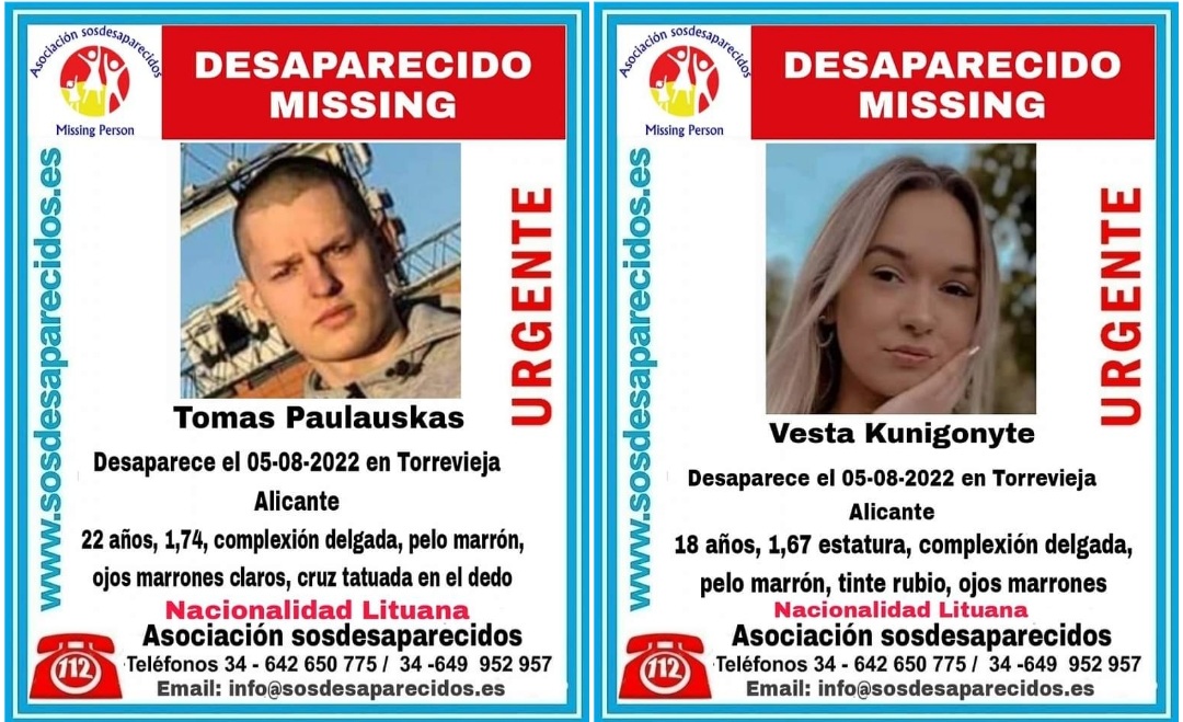 El día pasado 5 de Agosto, tanto Vesta como Tomas desaparecieron en Torrevieja. Ha sido el caso de la chica, el primero en salir a la luz pública. Posteriormente, la asociación «sosdesaparecidos» – asociación que también denuncia públicamente la desaparición de la chica – más concretamente en el día de hoy, publica la desaparición de Tomas.