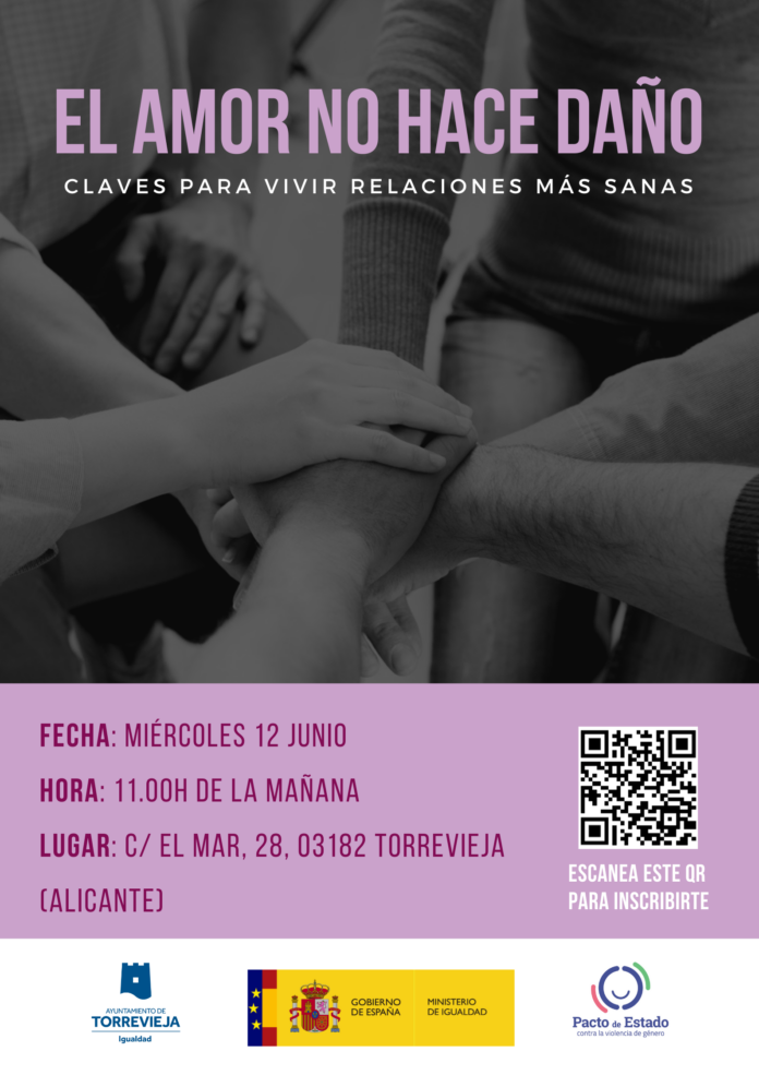 La dependencia emocional hacia la pareja implica una vinculación afectiva permanente excesiva de la otra persona, que resulta disfuncional. Para poder conocer y trabajar más en este ámbito, la Concejalía de Igualdad del Ayuntamiento de Torrevieja ha organizado dos talleres. Uno de ellos dirigido a mujeres víctima de violencia de género bajo el título “EL AMOR NO HACE DAÑO. CLAVES PARA VIVIR RELACIONES MÁS SANAS”, que se realizará mañana miércoles, 12 de junio, a las 11:00 horas, en el Centro Cultural Virgen del Carmen. Para poder asistir es necesario inscribirse a través del QR que aparece en el cartel.