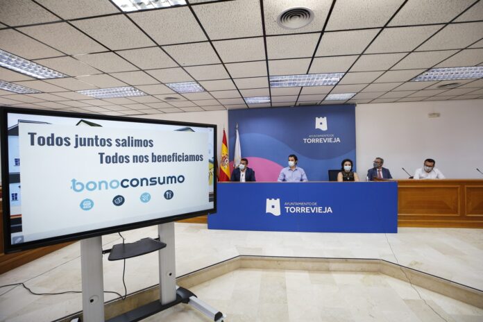 El alcalde de Torrevieja, Eduardo Dolón, junto con la concejal de Comercio y Hostelería, Rosario Martínez, el concejal de Economía y Hacienda, Domingo Paredes, el presidente de la Asociación de Pequeños y Medianos Comerciantes (APYMECO), Jorge Almarcha, y la responsable de la empresa Impronta Soluciones, Alicia Lozoya, han presentado en la mañana de hoy el BONO CONSUMO, una iniciativa del Ayuntamiento de Torrevieja en colaboración con APYMECO, para incentivar la compra en todos los sectores productivos de la localidad, especialmente en el Comercio y la Hostelería.