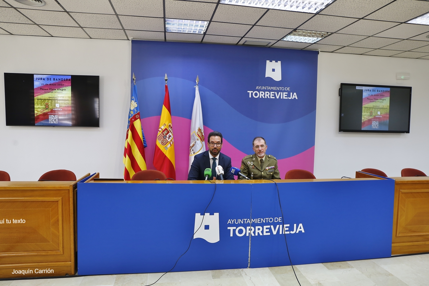 El concejal de Seguridad y Emergencias del Ayuntamiento de Torrevieja, Federico Alarcón, junto con el jefe de Comunicaciones del MOE, el comandante Alfonso Blas López, han presentado en la mañana de hoy el acto de Jura de Bandera para personal civil que se celebrará el próximo sábado, 21 de mayo, a las 12:00 horas, en el Paseo Vista Alegre.