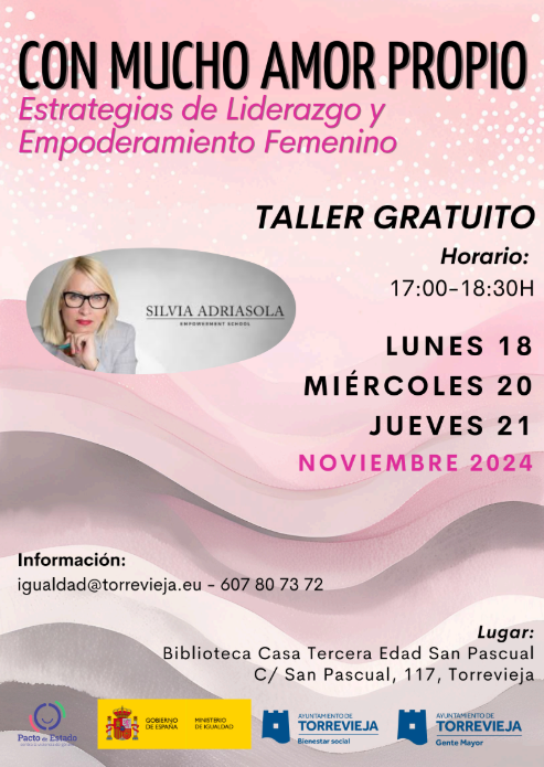 Por otro lado se ha organizado el taller “CON MUCHO AMOR PROPIO. ESTRATEGIA DE LIDERAZGO Y EMPODERAMIENTO FEMENINO”. Lo llevará a cabo Silvia Adriasola Dra. de Empowermet School, Executive &Gnder Coach, Experta en Liderazgo y Empoderamiento Femenino y Agente de Igualdad Empresarial.