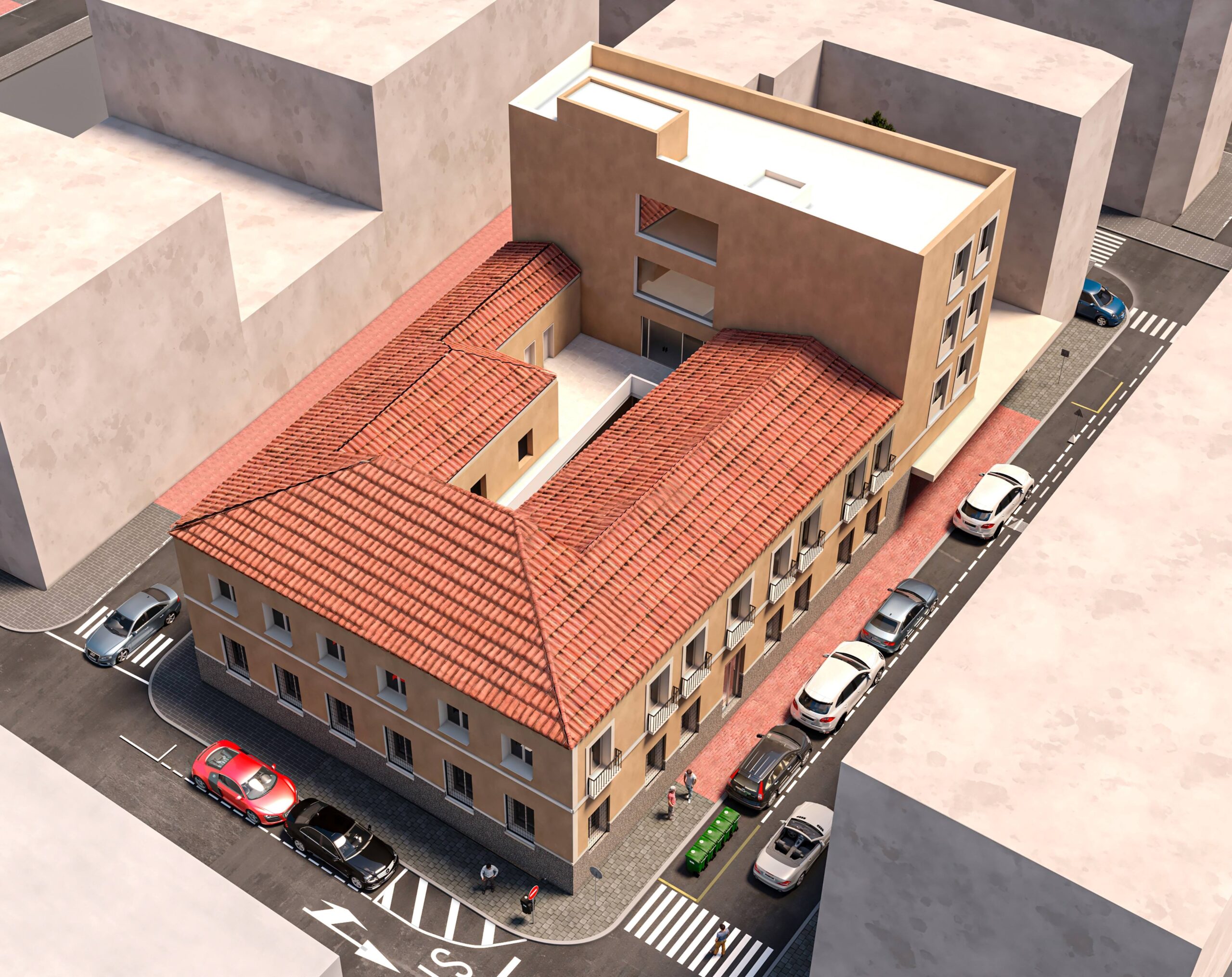 Una imagen de la fachada principal en la que se aprecia un diseño funcional y moderno, totalmente accesible, respetuoso con el entorno urbano del centro histórico. Se observa cómo se respeta la fachada histórica del Parvulario y de la residencia de ancianos.