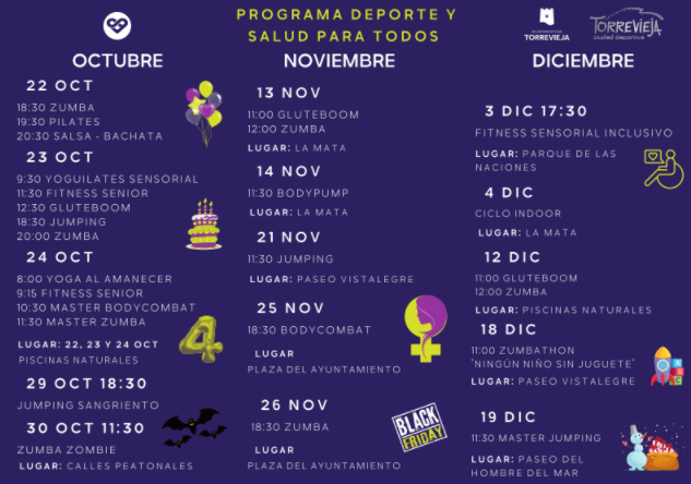 Desde el 22 de octubre al 19 de diciembre, en horario de mañana y tarde, el programa “Deporte y salud para todos” contará con numerosas actividades deportivas destinadas también a personas capacidades distintas: zumba, pilates, salsa-bachata, fitness, jumping, gluteboom, yoga, ciclo indoor, etc.
