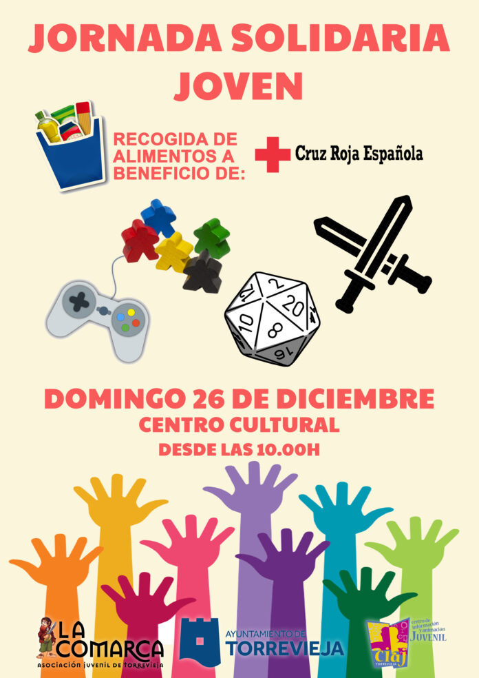 La Concejalía de Juventud del Ayuntamiento de Torrevieja informa que el domingo, 26 de diciembre, durante todo el día y de manera ininterrumpida desde las 10:00 horas, en el Centro Cultural Virgen del Carmen se celebrará una jornada solidaria joven por Navidad, organizada por la Concejalía de Juventud y la asociación juvenil La Comarca de Torrevieja.