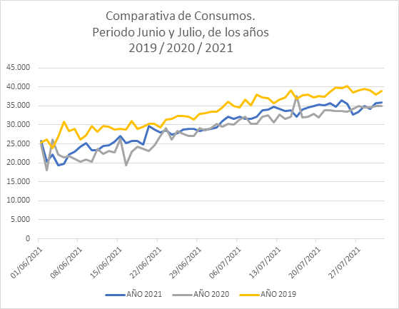 Cabe destacar de estos datos que el periodo de junio-julio de 2020, respecto a 2019 (antes de comenzar la pandemia), experimentó un descenso del 15,11%.