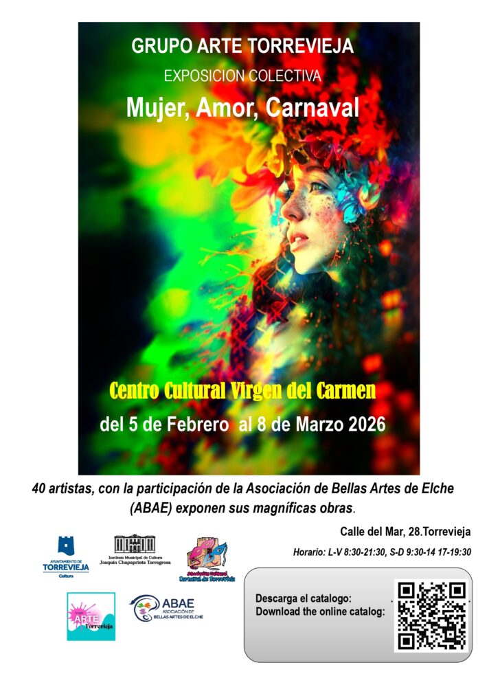 El Grupo Arte Torrevieja presenta una nueva exposición colectiva de pintura que toma como inspiración tres celebraciones clave del calendario: San Valentín, el Carnaval y el Día Internacional de la Mujer, fechas que coinciden plenamente con el periodo expositivo y que sirven como eje temático de la muestra.