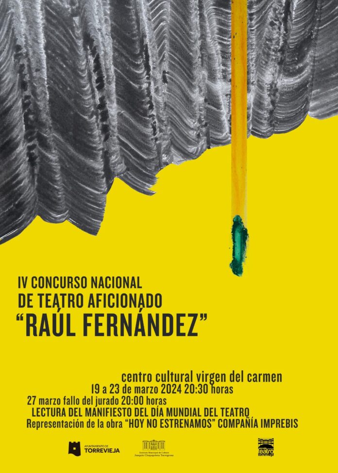 Será el miércoles, 27 de marzo, en el Centro Cultural Virgen del Carmen donde se dará a conocer el fallo del jurado, así como la lectura del manifiesto del Día Mundial del Teatro a cargo del profesor, director y actor Antonio de Béjar, y la representación teatral de la aclamada y archiconocida compañía Imprebìs, con su espectáculo de comedia “Hoy no estrenamos”.