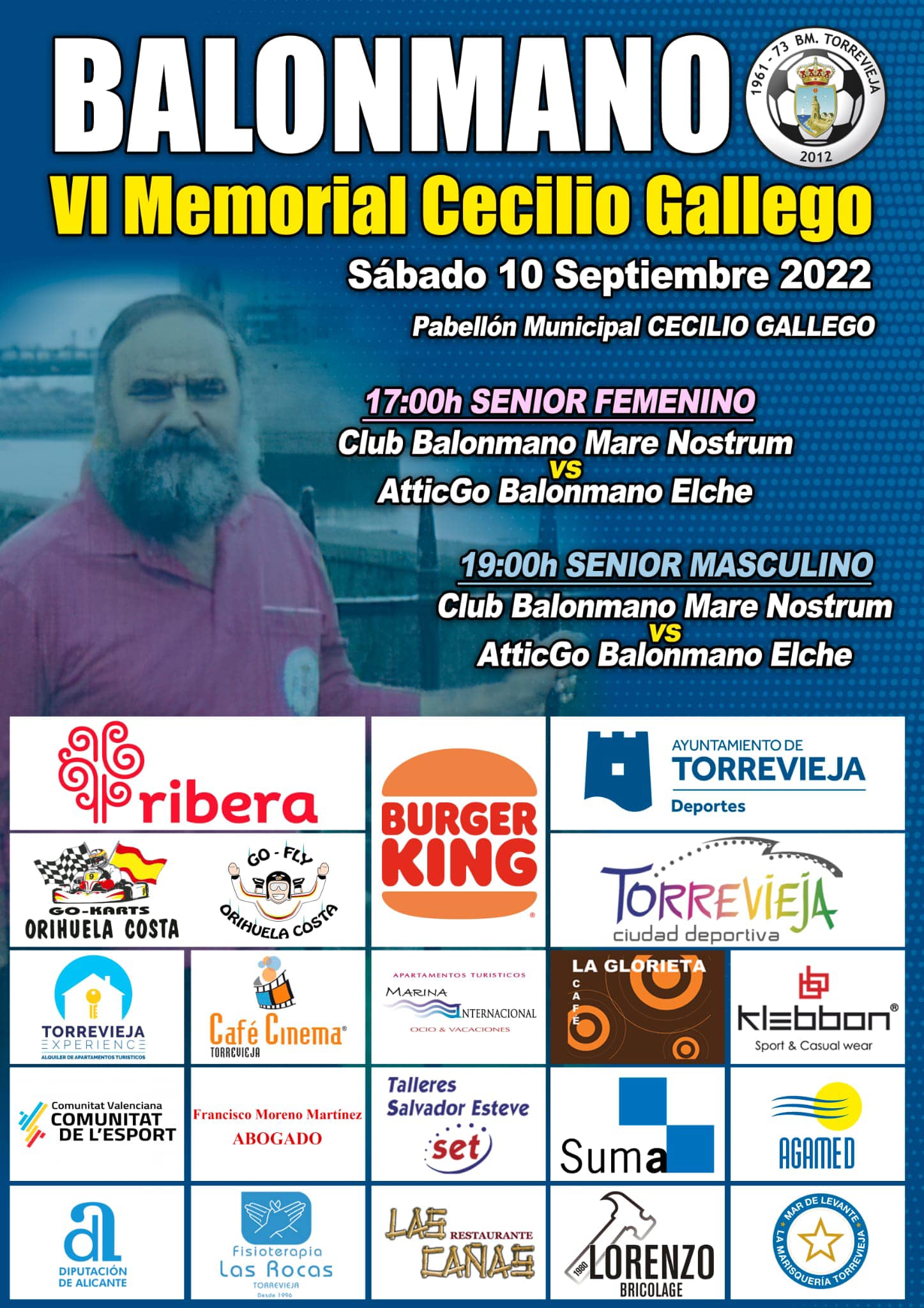 El Club Balonmano Mare Nostrum Torrevieja homenajeará a Cecilio Gallego este próximo sábado diez de septiembre, en su VI Memorial, que se llevará a cabo en el pabellón que lleva su nombre. El club recordará la figura del alcazareño con dos partidos amistosos entre los equipos senior del club y los del Club Balonmano Elche, cuando se cumplen 20 años del atentado que acabó con su vida en Santa Pola.