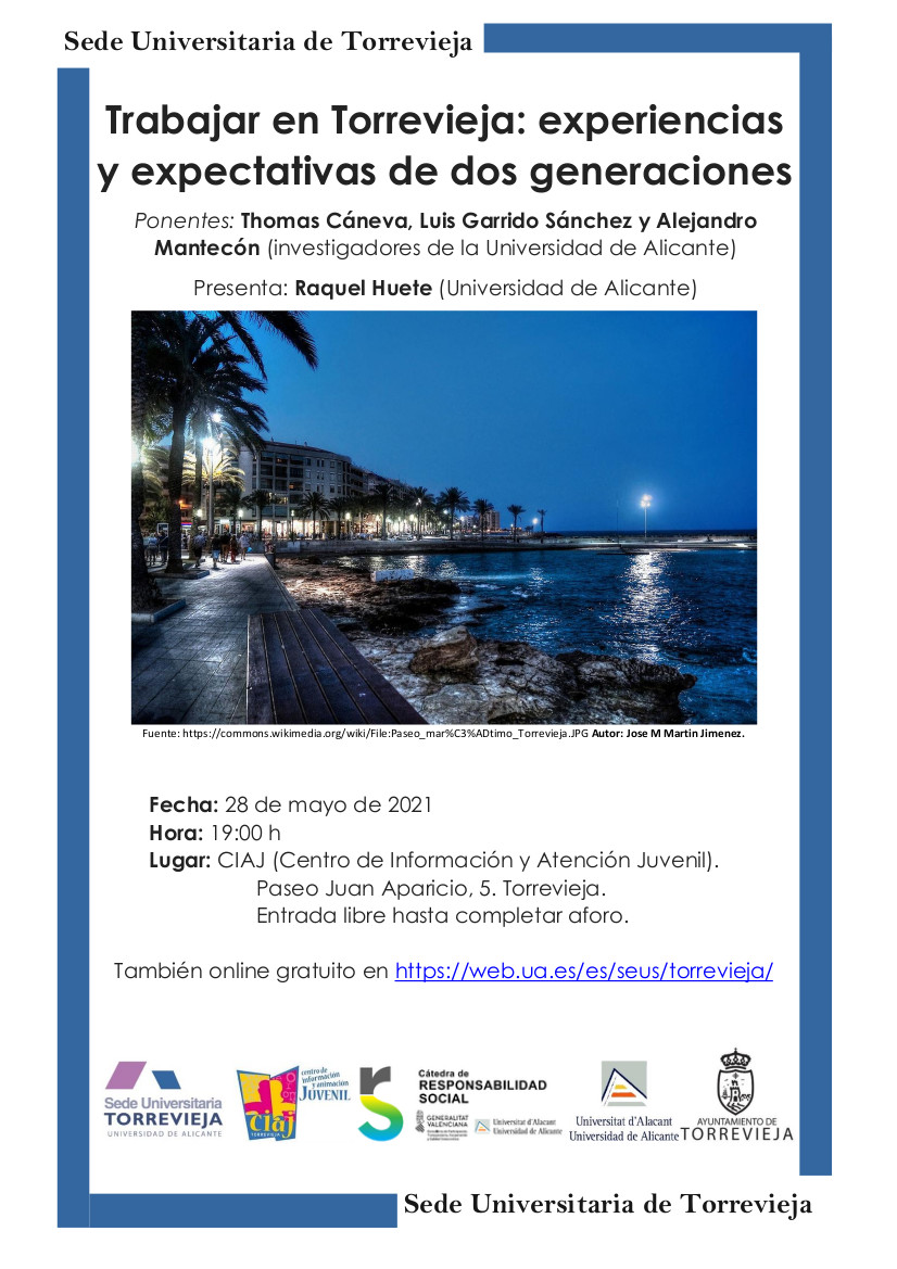 El Ayuntamiento de Torrevieja y la Sede Universitaria de la UA en Torrevieja, han organizado una charla el próximo viernes, 28 de mayo, a las 19:00 horas, en el Centro de Información y Animación Juvenil (CIAJ) bajo el título «Trabajar en Torrevieja: experiencias y expectativas de dos generaciones». La entrada será libre hasta completar el aforo. También se podrá seguir a través de la retransmisión online en https://meet.google.com/byh-akhq-fkt.