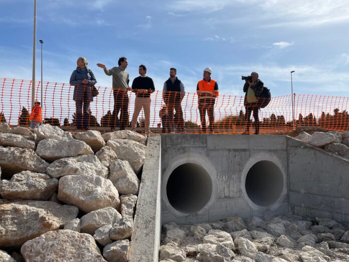 El alcalde de Torrevieja, Eduardo Dolón, la concejal de Servicios Urbanos, Sandra Sánchez, el gerente de AGAMED, Jorge Ballesta, la gerente adjunta, Gemma Cruz, y el Jefe de Obras de AGAMED, Miguel Mazón, han visitado en la mañana de hoy las obras de ampliación de la balsa de laminación de aguas pluviales en la margen izquierda de la carretera N-332, en la urbanización Doña Inés. Unas obras que comenzaron en julio de 2023, que recibe las aguas procedentes de la balsa de laminación anexa al recinto de Los Mercados y de la cuneta de la margen este de la N-332, y que estarán totalmente finalizadas durante el próximo mes de marzo.