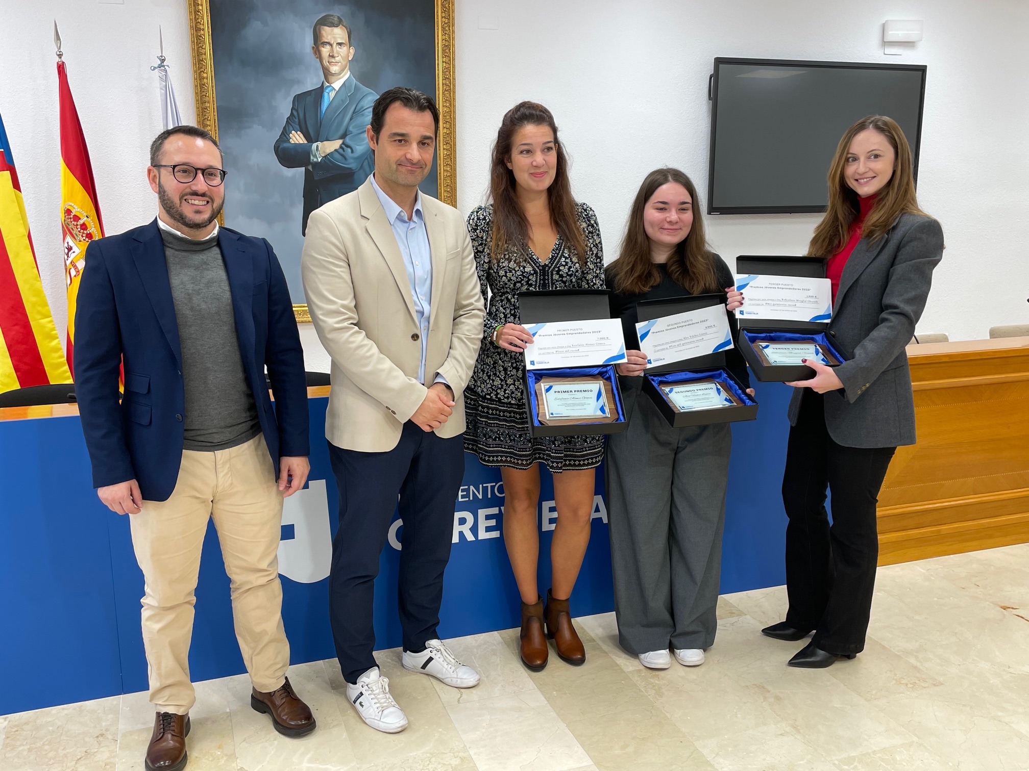 El alcalde de Torrevieja, Eduardo Dolón, y el concejal de Fomento del Empleo, Desarrollo Local y Emprendimiento, Domingo Paredes, han hecho entrega en la mañana de hoy de los Premios Jóvenes Emprendedores 2023 que organiza el Ayuntamiento de Torrevieja, y que ascienden en su totalidad a 12.000 euros en premios.
