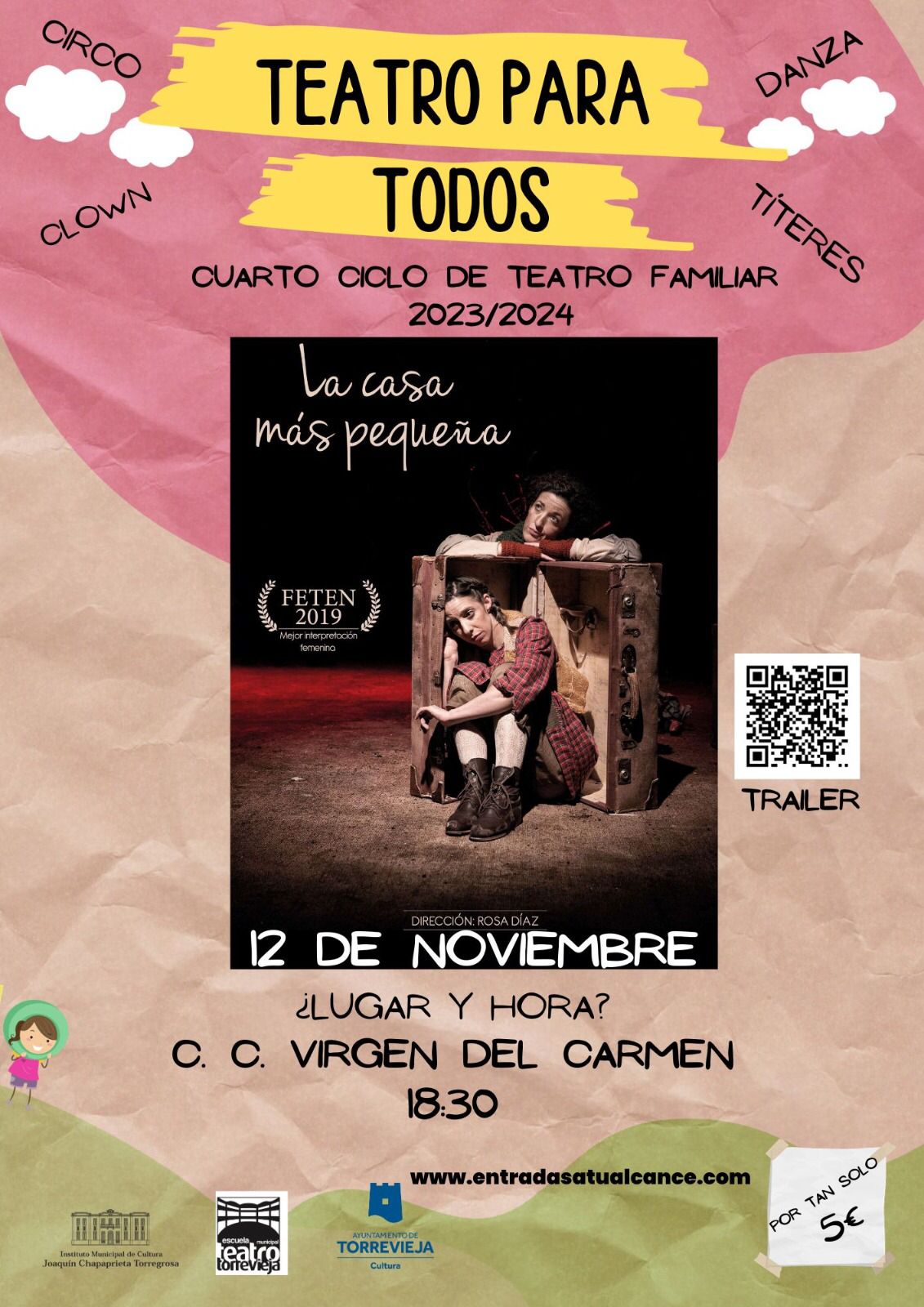Este próximo domingo, 12 de noviembre, continúa la IV edición del Ciclo de Teatro Familiar “Teatro para todos”, en el Centro Cultural Virgen del Carmen, a las 18:30 horas, con la representación de la obra “La casa más pequeña””. Edades recomendadas a partir de 5/6 años, con la entrada a un precio único de 5 euros.