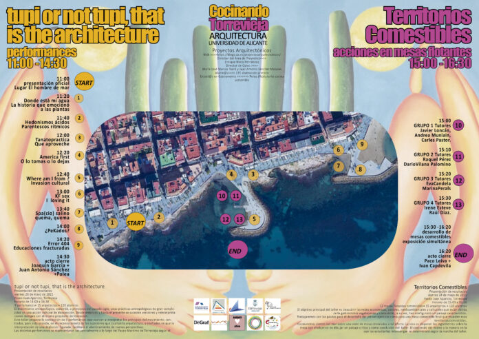 En Cocinando Torrevieja los organizadores detallan que “proponemos una inmersión en los diferentes aspectos en los que el asunto de ‘la comida’ se desarrolla en la ciudad de Torrevieja, caracterizado por un conjunto heterogéneo de historias, conflictos y realidades en el que compondremos nuevas cartografías gastronómicas desde la arquitectura y la ciudad, donde imaginemos y diseñemos nuevas posibilidades para un futuro más sostenible, inclusivo y evolucionado”. Las distintas actividades se representarán secuencialmente a lo largo del paseo marítimo de Juan Aparicio de Torrevieja, según el programa adjunto, invitando a la participación de los ciudadanos que acudan exprofeso o se crucen con ellas.