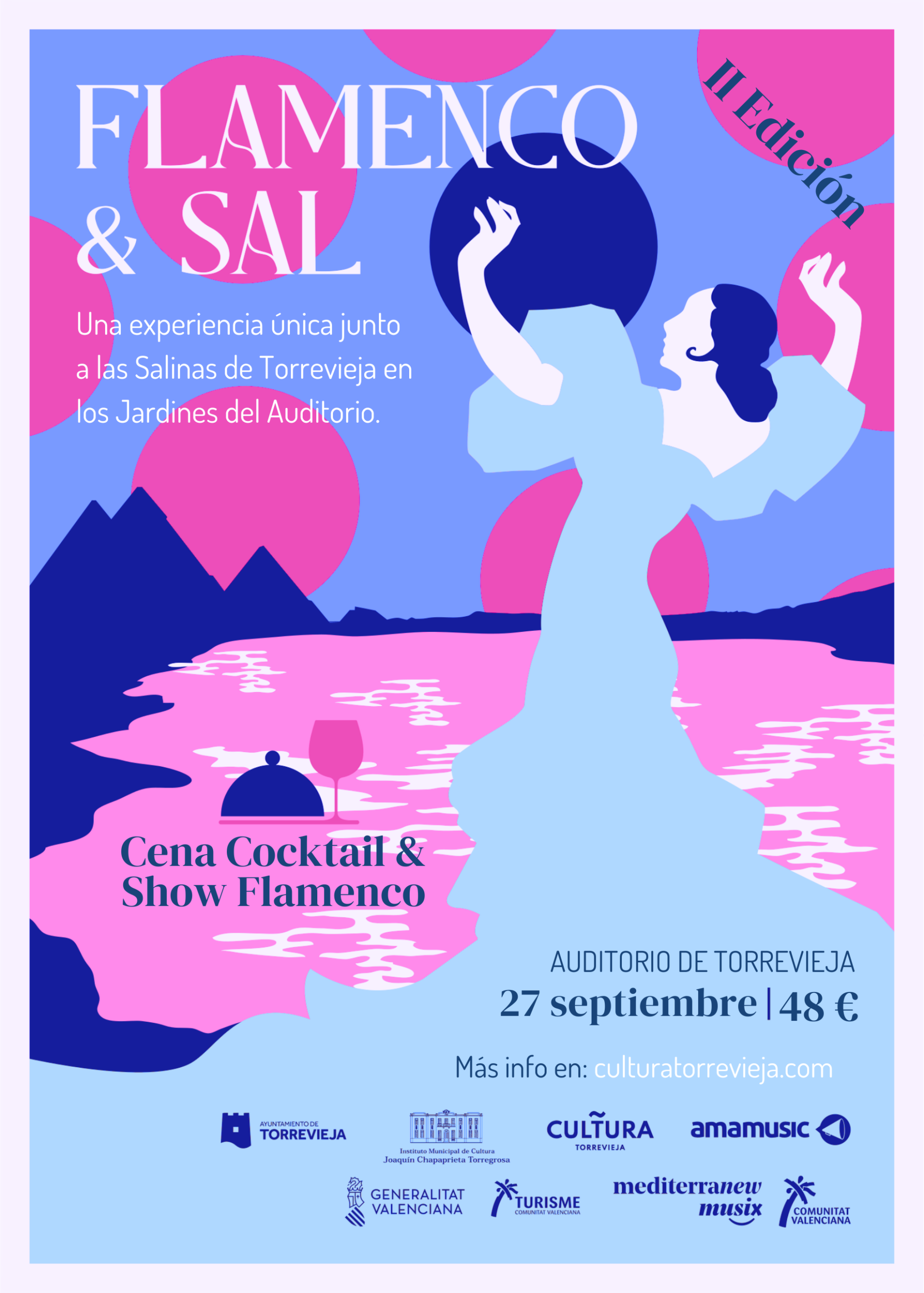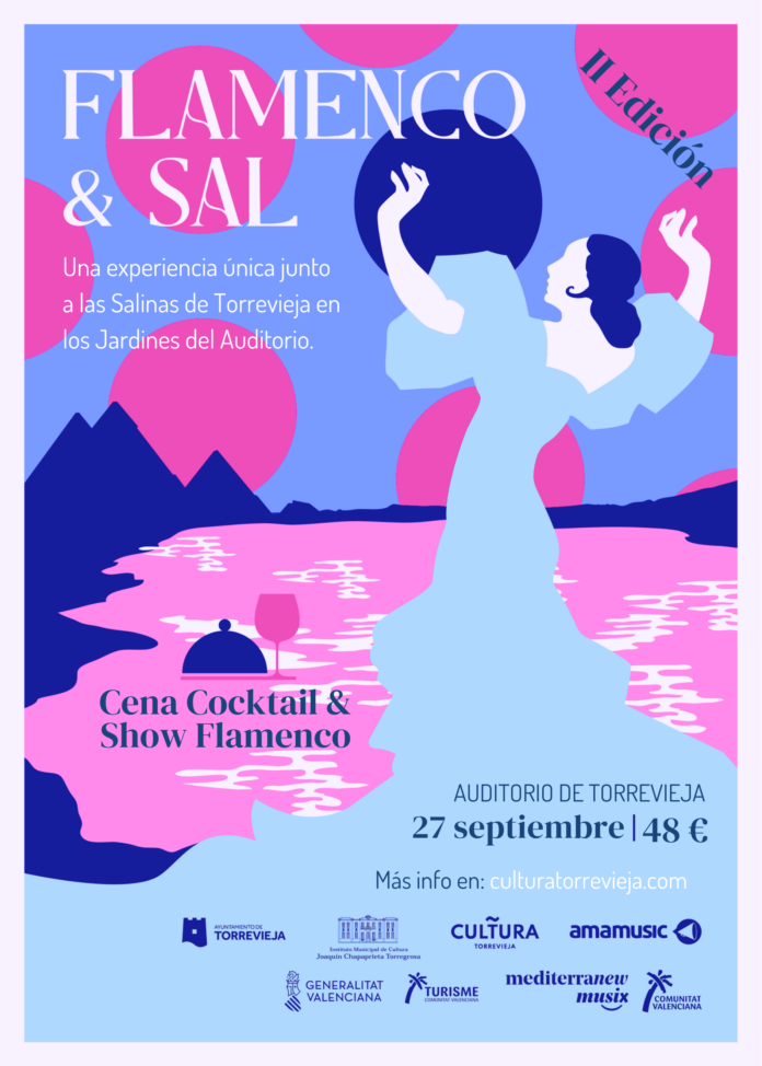 Tras el éxito de la primera edición en el pasado mes de agosto, ‘Flamenco y Sal’, ofrecerá otra mágica velada este próximo viernes 27 de septiembre a las 20:00 horas, en el marco de los jardines del Auditorio de Torrevieja. El público podrá disfrutar de la belleza del entorno y la cuidada puesta en escena, y de un espectáculo flamenco con cena cóctel al atardecer.