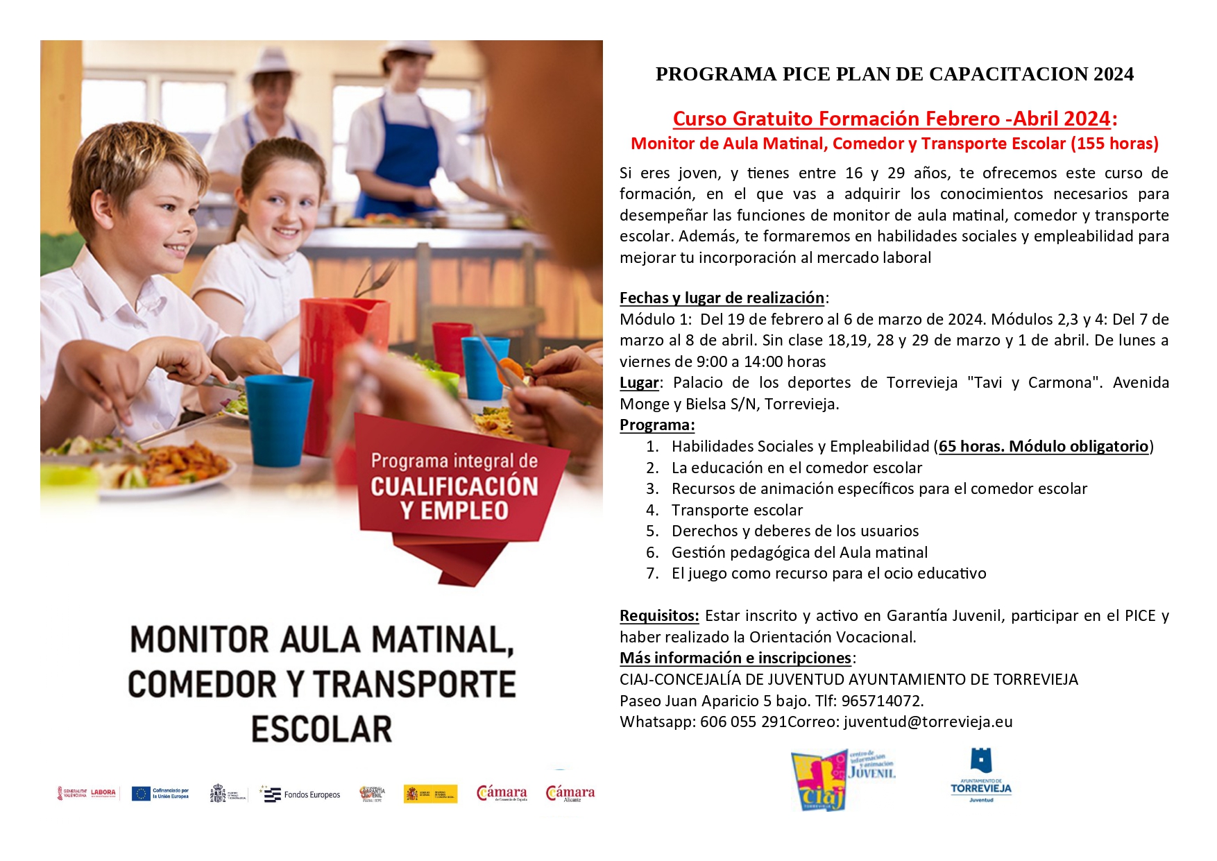 El concejal de Juventud del Ayuntamiento de Torrevieja, Domingo Paredes, informa que desde la Concejalía de Juventud, a través del Centro de Información y Animación Juvenil (CIAJ Torrevieja), se ha abierto el plazo de inscripción a un Curso de Monitor de Aula Matinal, Comedor Escolar y Transporte Escolar, con una duración de 90 horas lectivas para el primer trimestre del año.