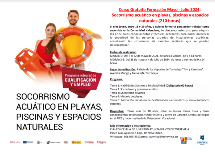 El concejal de Juventud del Ayuntamiento de Torrevieja, Domingo Paredes, informa que desde la Concejalía de Juventud, a través del CIAJ, ya se ha abierto el plazo de inscripción para matricularse en un curso de Socorrismo Acuático en playas, piscinas y espacios naturales con un total de 210 horas de formación teórico-práctica.