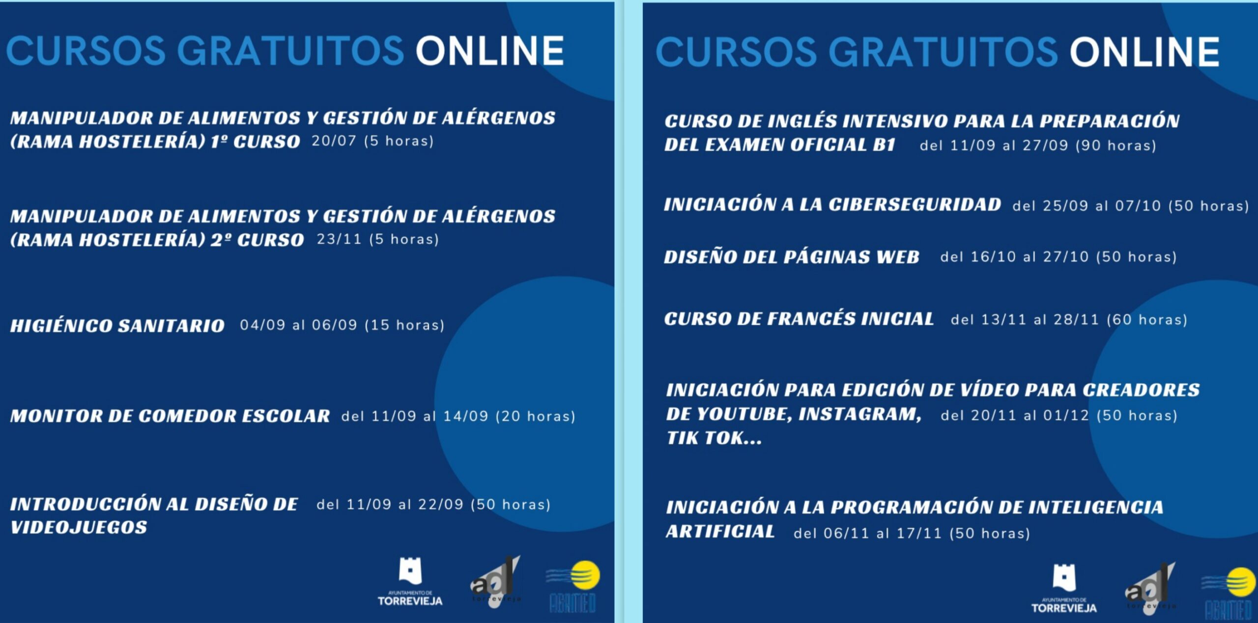 El concejal de Empleo y Fomento, Domingo Paredes, informa que el Ayuntamiento de Torrevieja, a través de la Agencia de Desarrollo Local (ADL) y gracias al convenio firmado con AGAMED, impartirá 11 cursos gratuitos online, que se desarrollarán entre los meses de julio y diciembre de 2023.