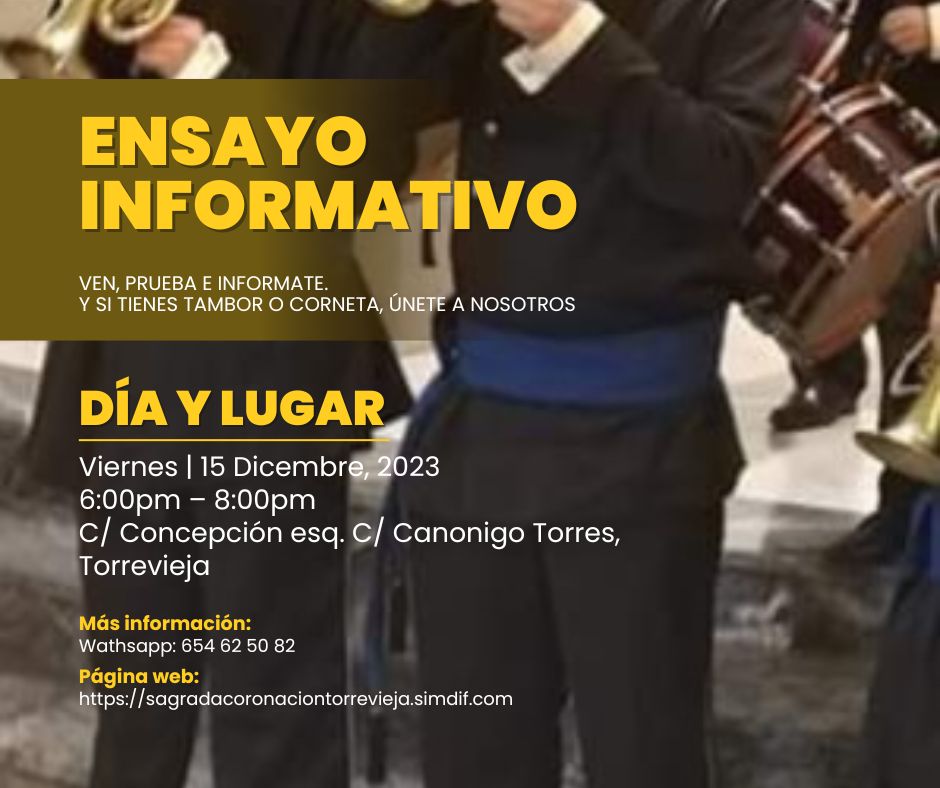 El próximo viernes viernes 15 de diciembre, a partir de las 18h y en la confluencia de las calles Concepción con Canónigo Torres, en el centro de Torrevieja, la Banda de Cornetas y Tambores Sagrada Coronación de Espinas realizará un ensayo informativo. Dicha actividad consistirá en presentar la Banda a todos los interesados y transeúntes, con la posibilidad de que todo aquel que lo desee pueda tocar un instrumento. Así mismo, se llevará a cabo una pequeña muestra de su repertorio musical y se facilitará información sobre cómo formar parte de la Banda.