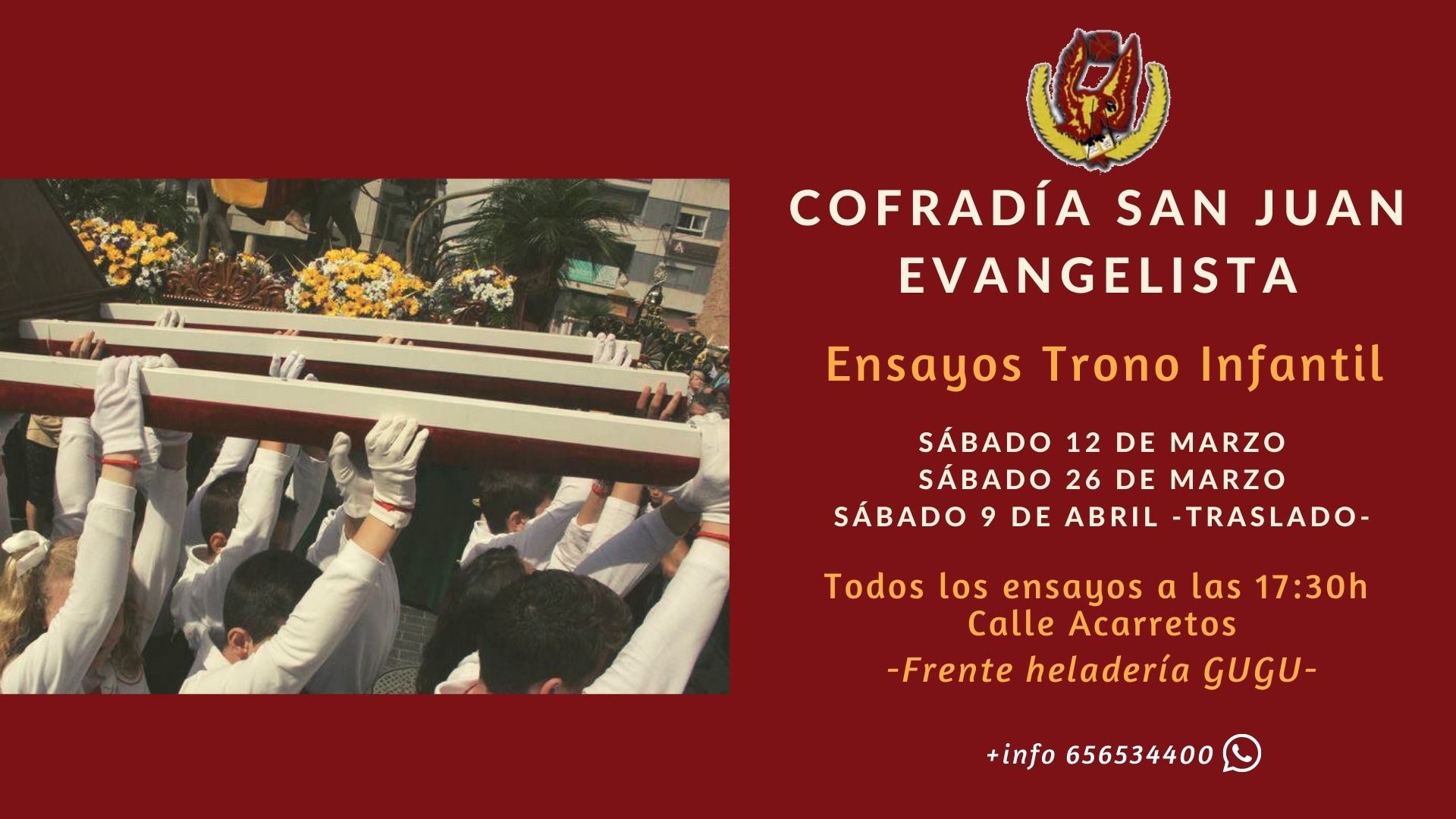 El próximo sábado, día 12 de marzo, a las 17,30 horas, comenzarán los ensayos del trono infantil de la Cofradía de San Juan o “Trono de los Evangelios”, que continuarán el sábado 26 de marzo y el sábado 9, realizando este día el traslado del trono a la Iglesia Arciprestal de la Inmaculada Concepción. Todos los ensayos se realizarán en la desde la Calle Acarretos, frente a heladería GuGu, a las 17,30h.
