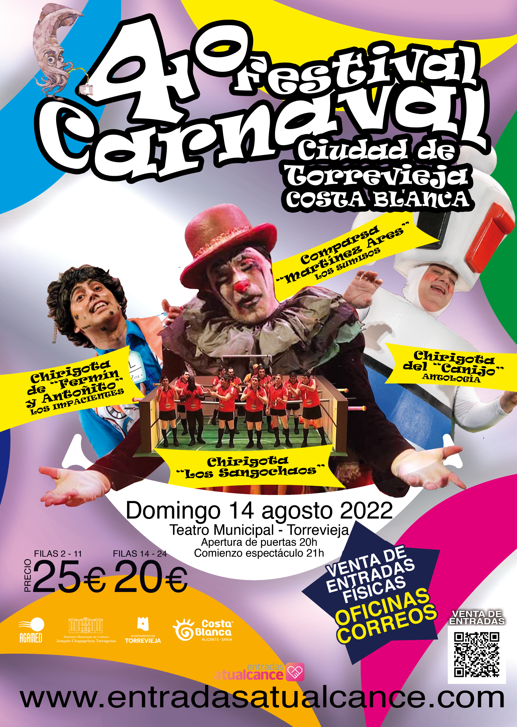 Un año más Torrevieja volverá a disfrutar de lo mejor de las agrupaciones carnavaleras de Cádiz, en la cuarta edición del Festival de Carnaval “Ciudad de Torrevieja–Costa Blanca”, que organiza la Chirigota de Torrevieja “Los Sangochaos” con el respaldo del Instituto Municipal de Cultura “Joaquín Chapaprieta”, el Patronato Provincial de Turismo “Costa Blanca” y Agamed.