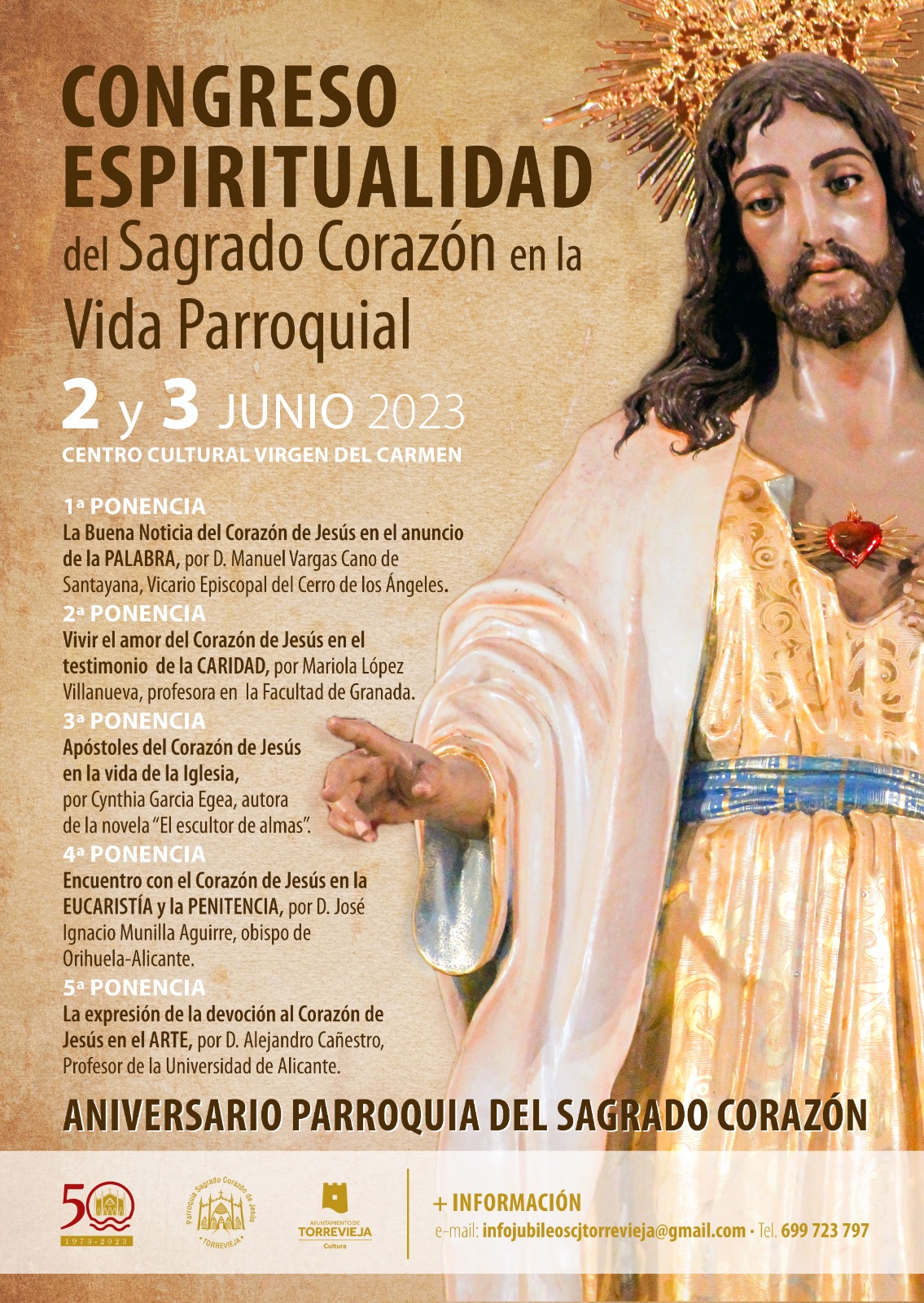 El Congreso sobre “Espiritualidad del Sagrado Corazón en la Vida Parroquial” tendrá lugar el 2 y 3 de junio de 2023 en el Centro Cultural Virgen del Carmen, Torrevieja y está abierto a todo el público inscrito en la parroquia, por teléfono en el 699723797 o en el correo infojubileoscjtorrevieja@gmail.com