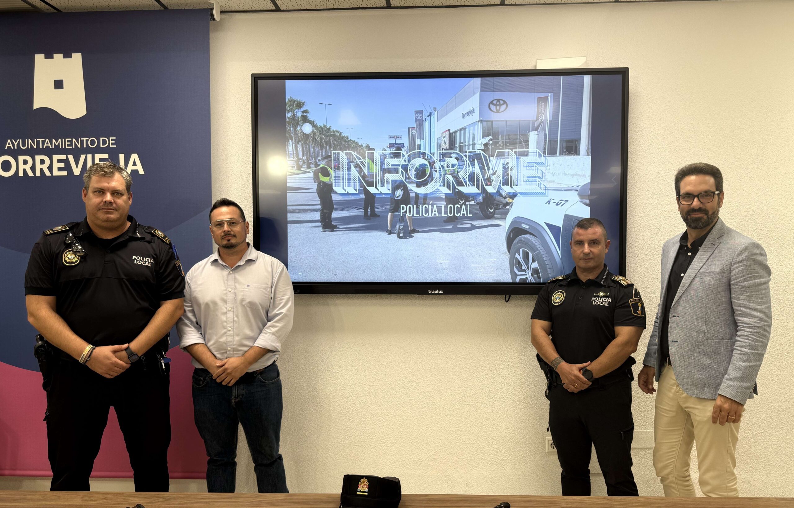 El concejal de Seguridad y Emergencias, Federico Alarcón, acompañado por el Intendente Jefe de la Policía Local de Torrevieja, Óscar Cartón, el coordinador de Seguridad y Emergencias, Adrián Ballester, y el Director General de la Policía, Alejandro Morer, ha presentado hoy un balance de las actuaciones policiales durante los meses de verano.