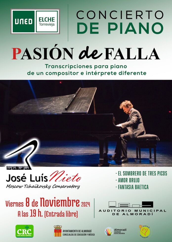 El aula de la UNED de Torrevieja ha organizado unos conciertos de piano, a cargo del intérprete y compositor José Luis Nieto, del conservatorio Tchaikovsky de Moscú, recién premiado con el diploma de honor al mérito artístico y musical por la Diputación de Cádiz, junto al cantante y compositor Alejandro Sanz. Se trata de una gran  oportunidad de contemplar y oír una original interpretación sobre música del genial compositor Manuel de Falla, autor de obras como El amor brujo, Sombrero de tres picos y la genuina y virtuosa Fantasia Baetica.