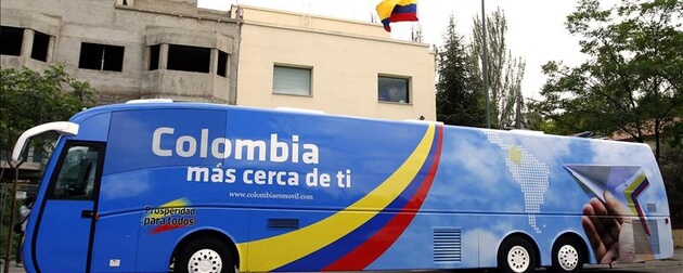 ‘Colombia más cerca de ti’, es un bus con cinco puestos de trabajo que cuenta con la tecnología para la atención de trámites requeridos por sus connacionales residentes en toda la Península Ibérica. Dispone de conectividad a internet que permite la interacción en tiempo real con los sistemas informáticos del Ministerio de Relaciones Exteriores de Colombia.